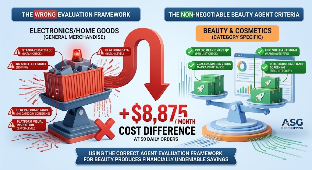 Five criteria determine whether a dropshipping agent is equipped for beauty and cosmetics: (1) compliance screening capability against EU Annex II/III prohibited substances and US MoCRA INCI requirements, with documentation available on request; (2) FIFO shelf-life management with a defined minimum remaining shelf life threshold before fulfillment — 12 months is the EU standard; (3) beauty-specific QC protocols including colorimetric ΔE measurement, seal integrity testing, and fragrance consistency verification; (4) private label and branded packaging support without MOQ restrictions; (5) subcategory-specific defect rate data below 6% for beauty, versus the platform average of 9–12%.