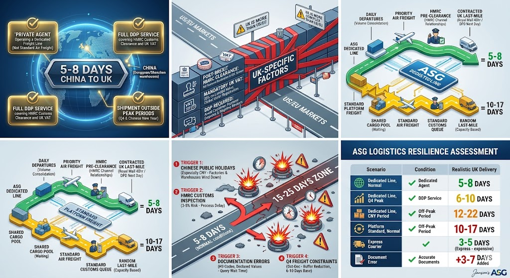 October through December is the highest-volume period for China-UK e-commerce freight. Dedicated freight lines maintain their 5–8 day baseline through Q4 but with reduced buffer — realistic Q4 delivery windows on dedicated lines run 6–10 days rather than 5–8. During Q4 2024 peak season from November 1–15, ASG maintained a 97.3% on-time delivery rate to UK addresses at 23,000 orders per day — while standard platform freight lines saw typical delays of 15–25 days during the same period. The gap between dedicated and platform freight widens most during peak season.