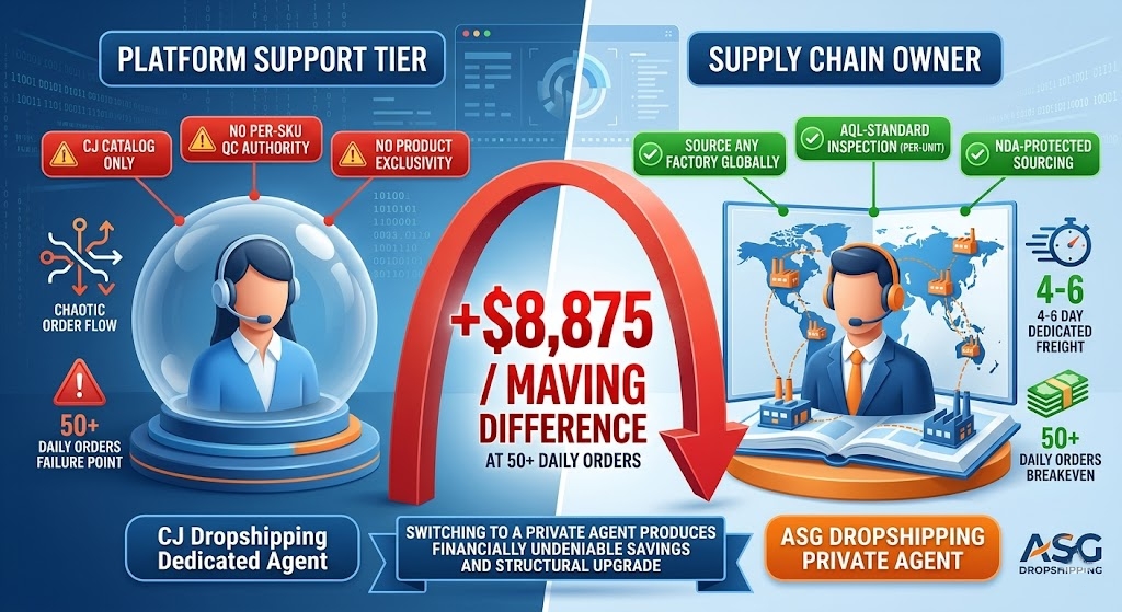 CJ Dropshipping’s “dedicated agent” feature is a platform support tier — not a private supply chain relationship. CJ dedicated agents operate within CJ’s catalog and policies: they cannot source products outside CJ’s existing inventory, cannot define per-SKU quality inspection criteria, and cannot prevent your winning SKUs from being visible to CJ’s 2M+ seller base. A true private dropshipping agent owns sourcing, QC protocol, supplier exclusivity, and exception resolution independently of any platform. The structural difference determines whether your supply chain scales with your store or becomes its bottleneck.