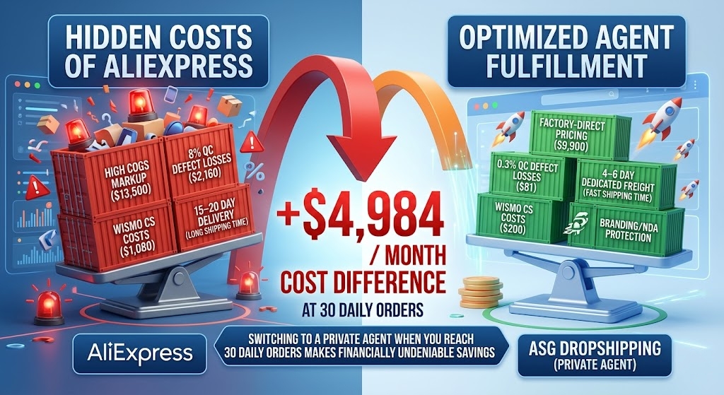 Switch from AliExpress to a private dropshipping agent when you consistently hit 30 daily orders across 3+ validated winning SKUs. At that volume, COGS savings from factory-direct pricing (20–40% below AliExpress retail) exceed the private agent handling fee ($1.50–$2.00/order) from day one. Below 20 daily orders, the math doesn’t work. Above 30, staying on AliExpress costs $4,984/month in avoidable combined losses when all three hidden cost components are counted.